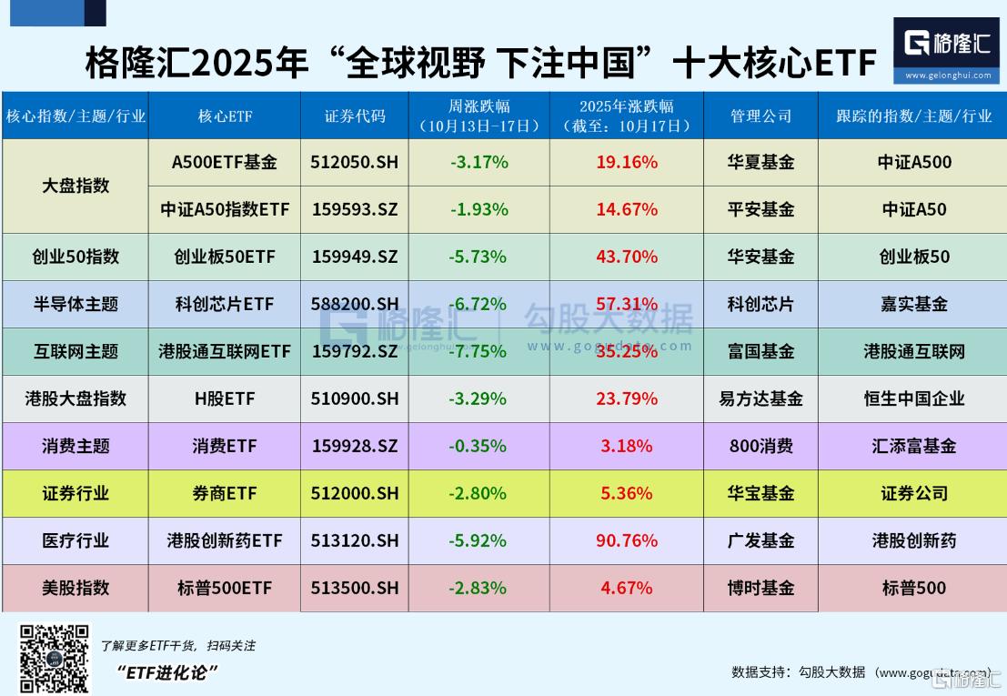 格隆汇2025年“全球视野,下注中国”十大核心ETF最新表现出炉,本周全线下挫,累计下跌4.05%。