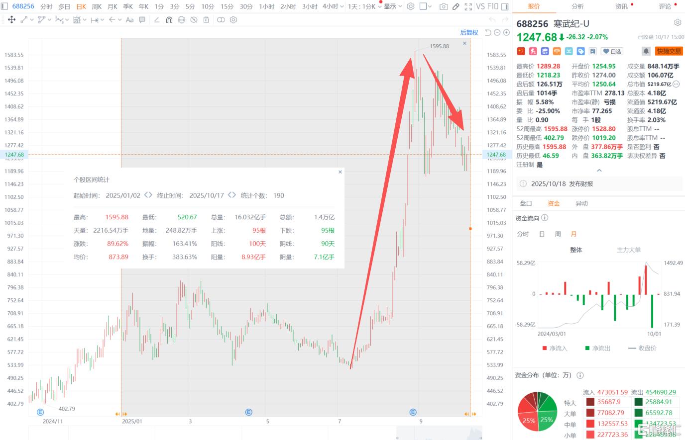 彼时,市场连连高呼“不寒而栗”,不过随后寒武纪又开启了震荡回调模式。