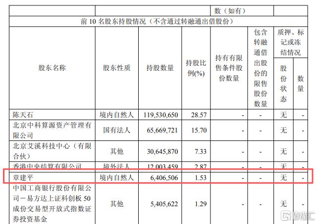 北京中科算源资产管理有限公司持股为15.7%,北京艾溪科技中心(有限合伙)持股为7.33%(艾溪合伙的实际控制人为陈天石),香港中央结算有限公司持股为2.87%。