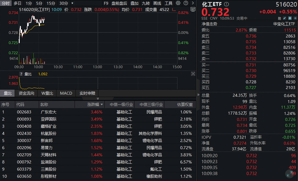 成份股方面,民爆用品、钾肥、锂电、其他化学原料等板块部分个股涨幅居前。截至发稿,广东宏大、亚钾国际双双大涨超3%,藏格矿业涨超2%,杭氧股份、新宙邦、易普力等多股涨超1%。