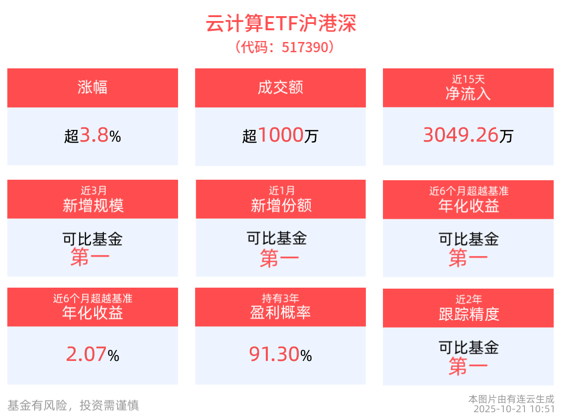 拉长时间看,截至10月20日,云计算ETF沪港深(517390)近3月规模增长1.74亿元,近1月份额增长1500.00万份,实现显著增长,新增规模、份额位均居可比基金第一。