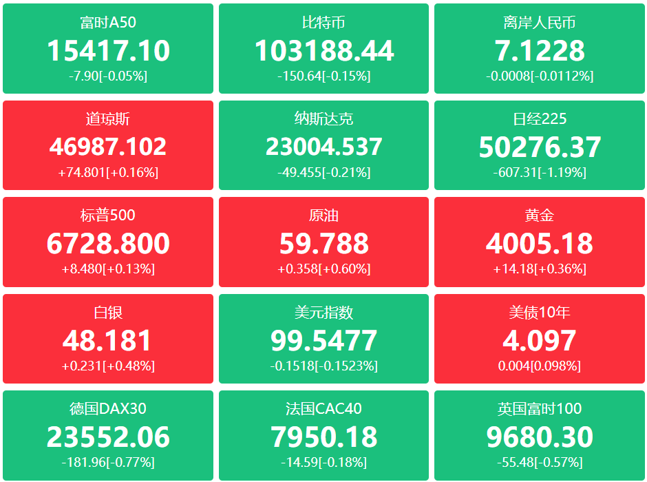 12月交割的WTI原油期货价格上涨0.54%,结算价为每桶59.75美元;1月交割的布伦特期货上涨0.39%,结算价为每桶63.63美元。衡量美元对六种主要货币的美元指数当天下跌0.47%,在汇市尾市收于99.735。由于美元走软以及美国政府停摆带来的不确定性加剧避险需求,金价重上4000美元关口。现货黄金收涨0.6%,报4000.99美元。