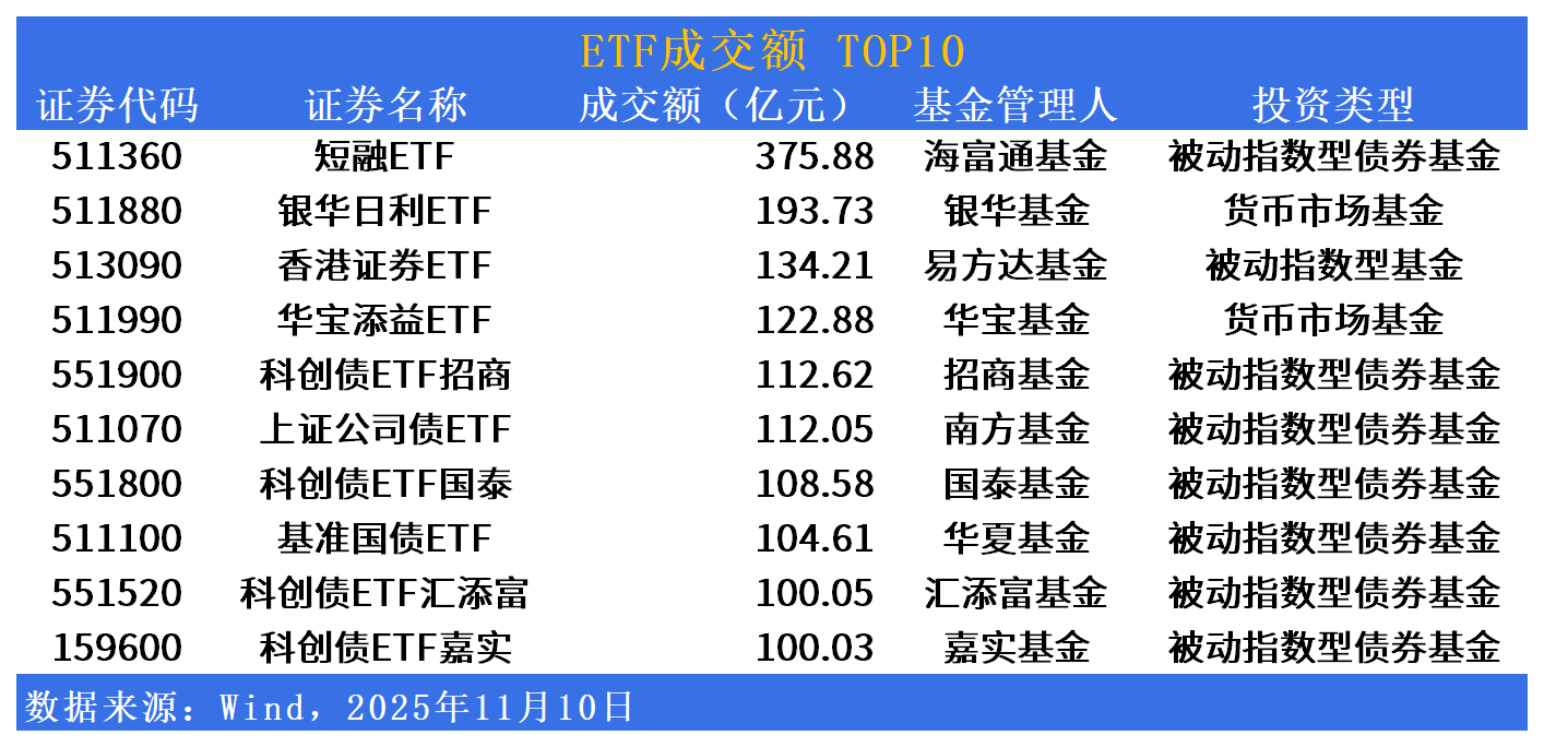 成交额方面,短融ETF(511360)今日成交额居首,达375亿元;银华日利ETF(511880)、香港证券ETF(513090)、华宝添益ETF(511990)成交额紧随其后。