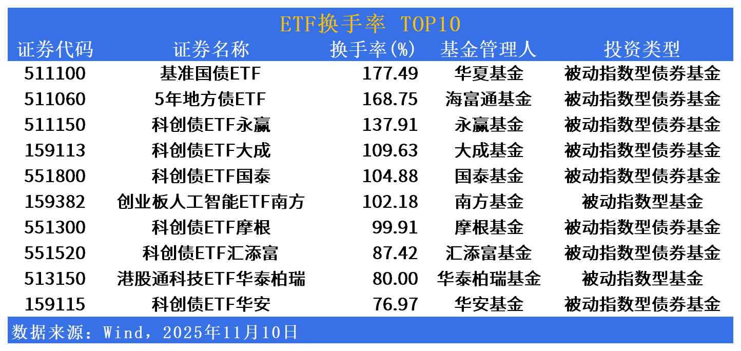 换手率方面,基准国债ETF(511100)换手率居首,达177%;5年地方债ETF(511060)、科创债ETF永赢(511150)、科创债ETF大成(159113)换手率居前。