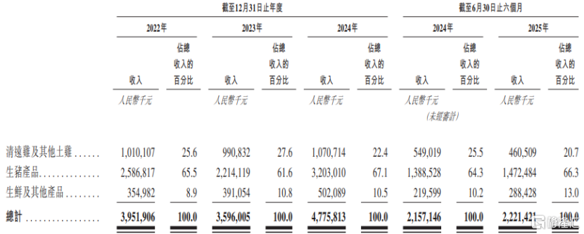 具体来看,2022年至2025年上半年(简称“报告期”),生猪产品为天农集团贡献了60%以上的收入,占比较大;清远鸡及其他土鸡的收入占比超过20%,生鲜及其他产品的收入占比在10%左右。