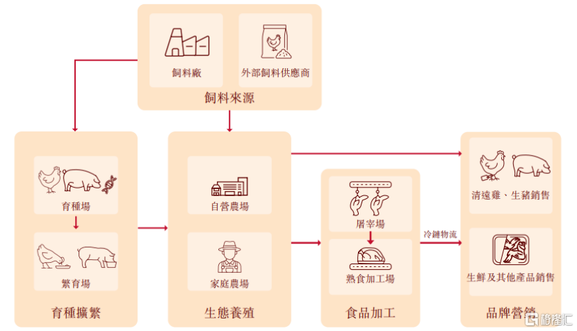 天农集团的业务模式贯穿整个清远鸡和生猪产业价值链,涵盖育种、良种繁育、生态养殖(通过自营农场模式及家庭农场模式)、饲料生产、屠宰及食品加工以及品牌营销。