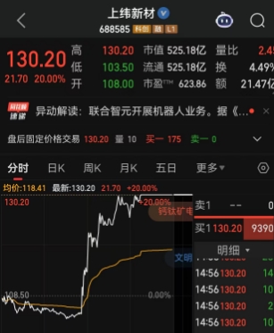 值得注意的是,上午11点11分尚处于A股交易时段。在上纬新材的自爆重磅消息之后,市场资金疯狂涌入,上纬新材股价直线拉升,从104.64元/股位置先后越过110元/股、120元/股、130元/股三道整数关口,最终在午后14点16分左右封住“20cm”涨停,报130.200元/股,总市值525.2亿元。若从104.64元/股低点位置算起,上纬新材涨幅达到24.43%,单日市值暴增超过103亿元。