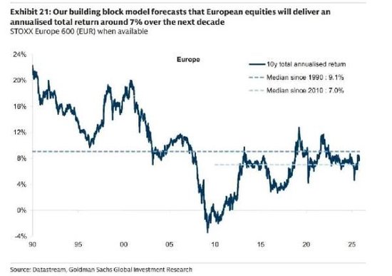 欧股盈利增长主要依靠全球化布局(收入60%来自欧洲以外),行业结构优化和高分红文化。若欧洲一体化、AI生产率提升或能源成本下降,则回报可突破10%;若经济重回2010-2019年低增长状态,回报将降至4%左右。