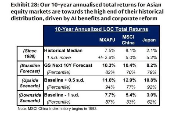 高盛认为,亚洲(不含日本)及新兴市场未来十年本币年化总回报分别为10.3%和10.9%,位列全球主要板块首位。
