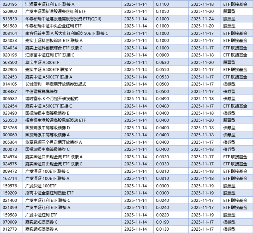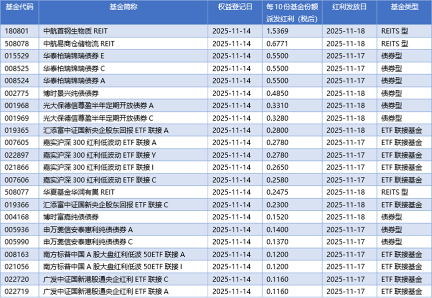 (1)11月14日新发基金共有5只,主要为ETF联接基金基金和混合型基金,其中富国中证工程机械主题ETF募集目标金额达80.00亿元;基金分红54只,多为ETF联接基金,派发红利最多的基金是中航首钢生物质封闭式基础设施证券投资基金,每10份基金份额派发红利1.5369元。