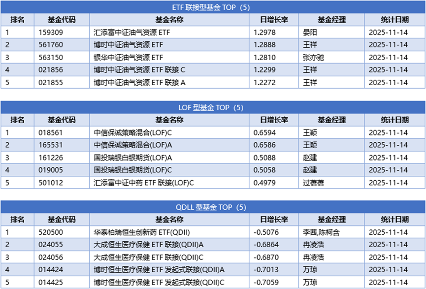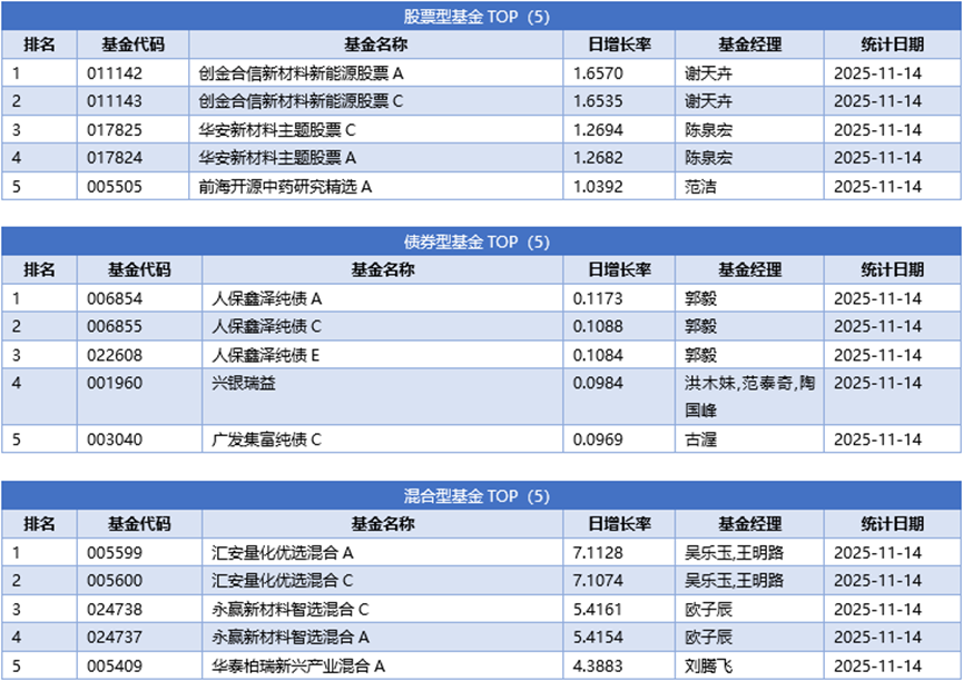 单基金方面,剔除掉 创新封基类型 基金的影响,11月14日业绩表现最好的基金为汇安量化优选混合A,日增长率为7.1128%,其次为汇安量化优选混合C,日增长率为7.1074%、永赢新材料智选混合C,日增长率为5.4161%。