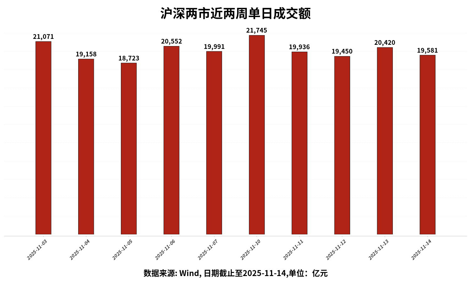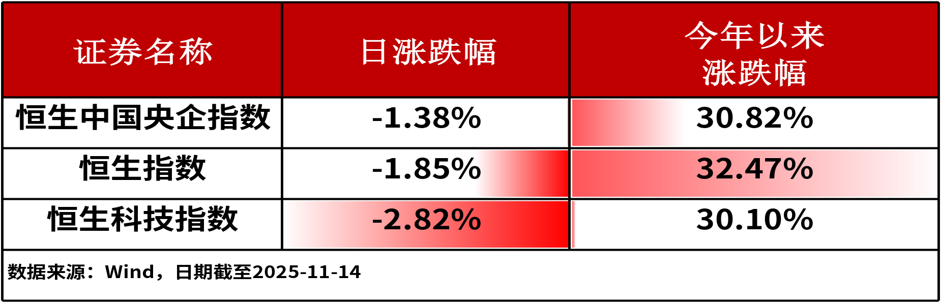 11月14日,A股三大股指全线收跌,上证指数下跌0.97%,深证成指下跌1.93%,创业板指下跌2.82%。主流宽基指数中,科创50指数下跌2.72%,跌幅相对较大。全市场共约1,960余只股票上涨。港股主流指数集体收跌。其中,恒生中国央企指数下跌1.38%,跌幅相对较小。沪深两市成交额为19581亿元人民币,相较上个交易日小幅缩量。