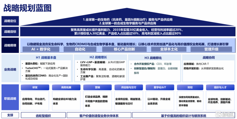 公司将23年的发展历程划分为五个清晰阶段:初创期(2002-2012)、业务多元化及扩张期(2013-2019)、成长阵痛期(2020-2025)、业务转型与内部协同期(2026-2028),最终在2029-2035年构建成为"领先的生物医药生态体系"。