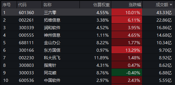截至11:03,软件50ETF(159590)标的指数热门成分股中,东方国信涨超13%,三六零涨停,拓维信息涨超6%,神州信息涨超4%,润和软件涨超3%,金山办公涨超1%。