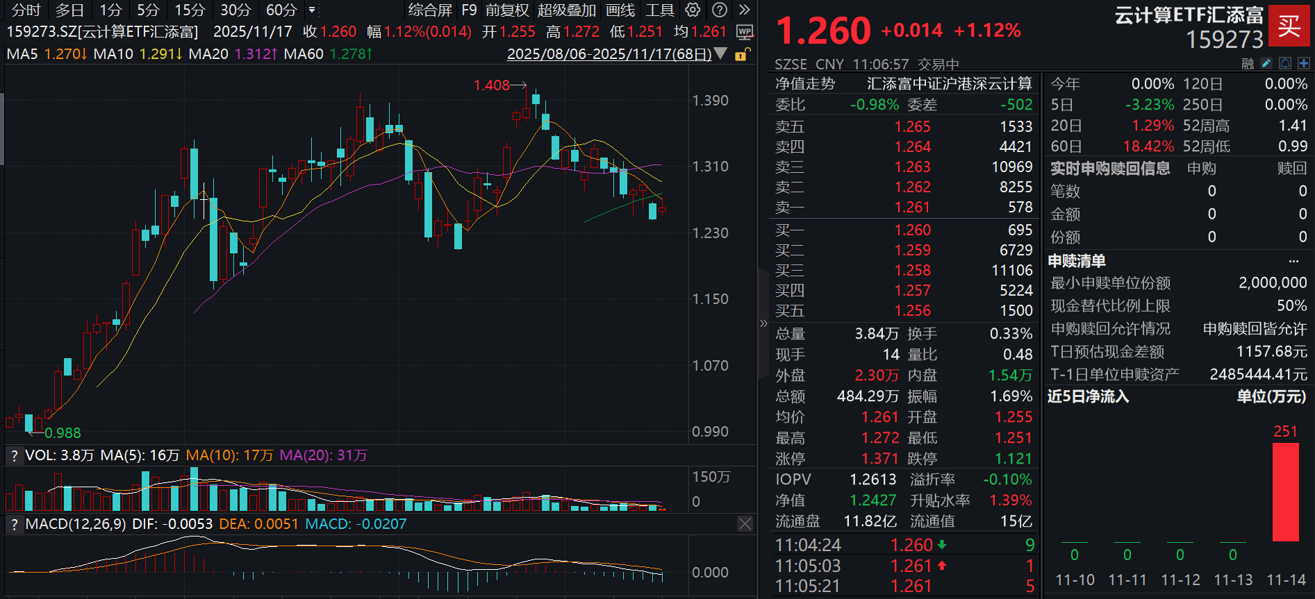今日(11.17),海外算力映射下,算力板块盘初走高,云计算ETF汇添富(159273)一度涨超2%,目前涨幅收窄至1.12%!截至11月14日,云计算ETF汇添富(159273)最新规模近15亿元,同类持续领先!