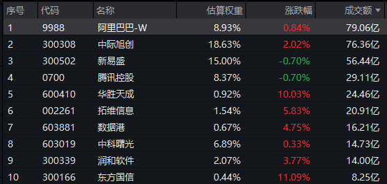 截至10:31,云计算ETF汇添富(159273)标的指数权重股多数飘红:东方国信涨超11%,华胜天成涨停,拓维信息涨超5%,数据港涨超4%,中际旭创涨超2%,阿里巴巴微涨。