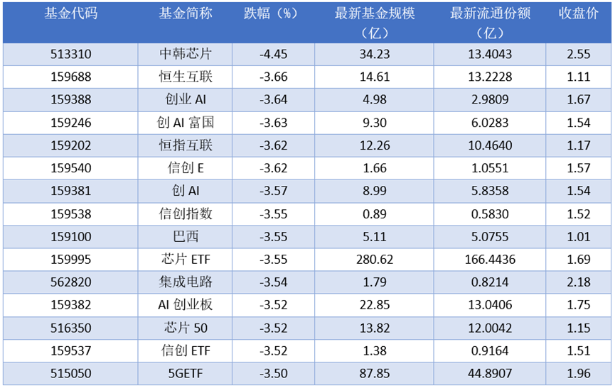 下跌方面,2025年11月14日跌幅最大的是中韩芯片(513310),跌幅达到4.45%。排名靠前的恒生互联(159688)、创业AI(159388)、创AI富国(159246),跌幅分别为3.66%、3.64%、3.63%。