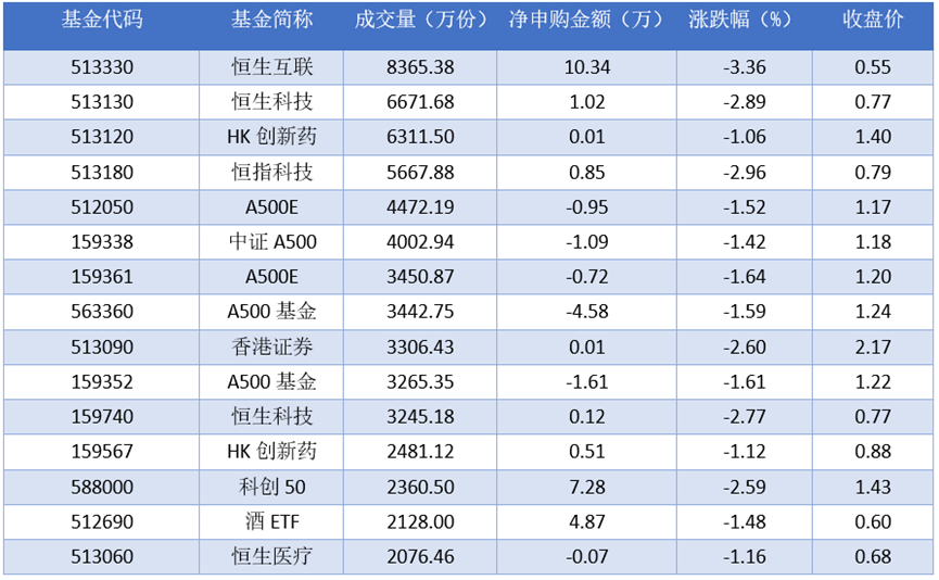从成交量上来看,2025年11月14日成交量最大的是恒生互联(513330),成交量为8365.38万份。排名靠前的恒生科技(513130)、HK创新药(513120)、恒指科技(513180),成交量分别为6671.68万份、6311.50万份、5667.88万份。