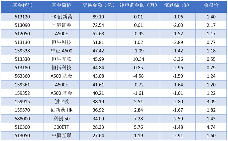 从成交金额上来看,2025年11月14日成交额最大的是HK创新药(513120),交易金额89.19亿元。排名靠前的香港证券(513090)、A500E (512050)、恒生科技(513130),成交额分别为72.54亿元、52.68亿元、51.81亿元。