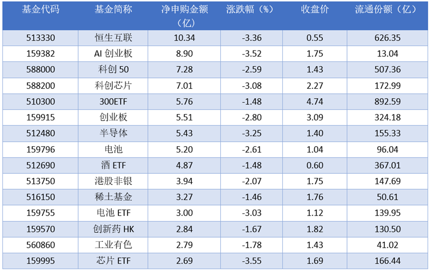 细分到资金流动情况上来看,2025年11月14日净申购金额最大的为恒生互联(513330),当日净申购金额为10.34亿元。排名靠前的AI创业板(159382)、科创50 (588000)、科创芯片(588200),申购金额为8.90亿元、7.28亿元、7.01亿元。