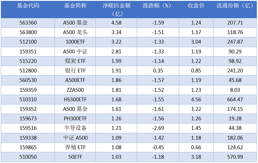 资金流出方面,2025年11月14日净赎回金额最多的是A500基金(563360),赎回金额4.58亿元。排名靠前的A500龙头(563800)、1000ETF (512100)、A500中证(159351),赎回金额分别为3.34亿元、3.22亿元、2.81亿元。