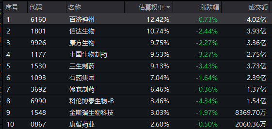 截至13:22,港股通创新药ETF(159570)标的指数成分股多数飘绿:中国生物制药、三生制药跌超3%,信达生物、康方生物跌超2%,石药集团跌超1%,百济神州、翰森制药微跌。
