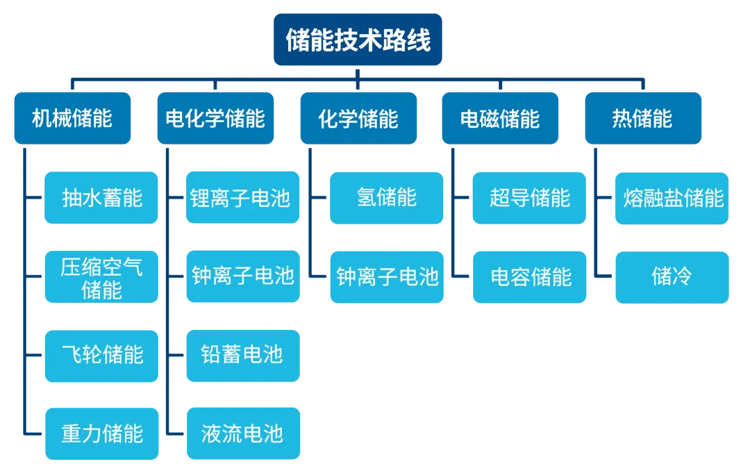 储能的技术路线众多,根据能量存储形式的不同,可以分为机械储能、电化学储能、化学储能、电磁储能和热储能等。