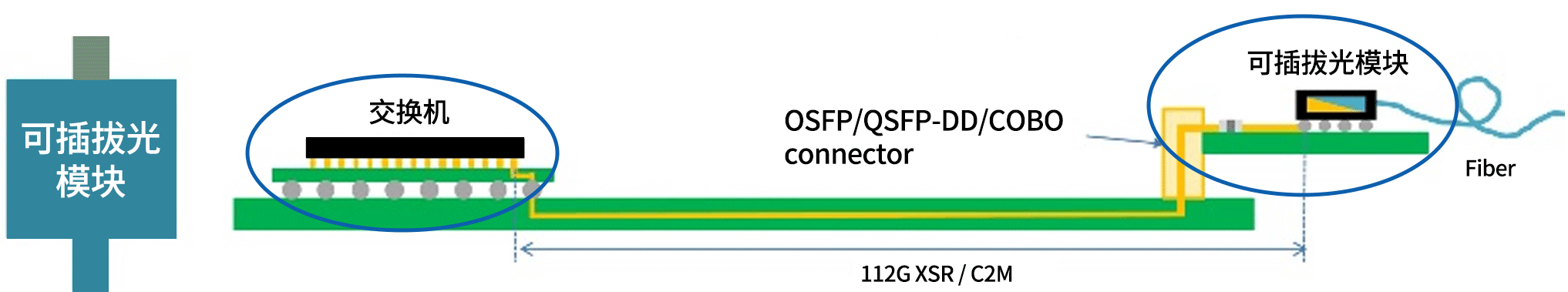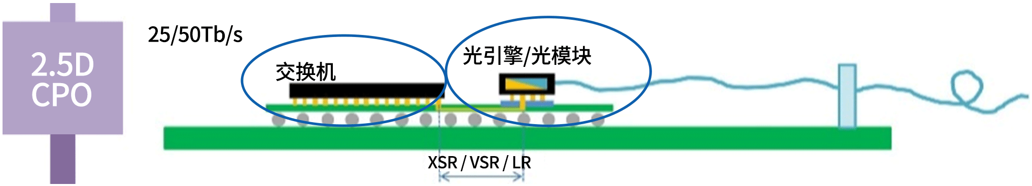 光电转换,以前采用的传统技术——可插拔方案。这项技术中,光模块和交换芯片的距离相隔比较远,如下图所示,光模块“独立外设”,通过接口与交换机相连,就好比他俩像在“异地办公”,有啥需要沟通传输的,还要靠“打电话”,信息传到对方的效率相对较慢,而CPO技术,采用“封装”的方式,把两者封装在一块基板上,拉近两者的距离,相当于从之前的“异地办公”,变成现在两者坐在旁边的“同桌协作”,有点啥事情,沟通起来效率更高,更省力,也就实现了更低时延、损耗和功耗。