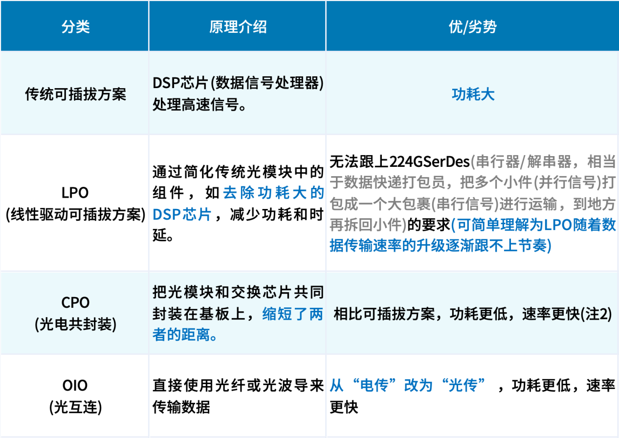 表 传统可插拔方案、LPO、CPO、OIO对比