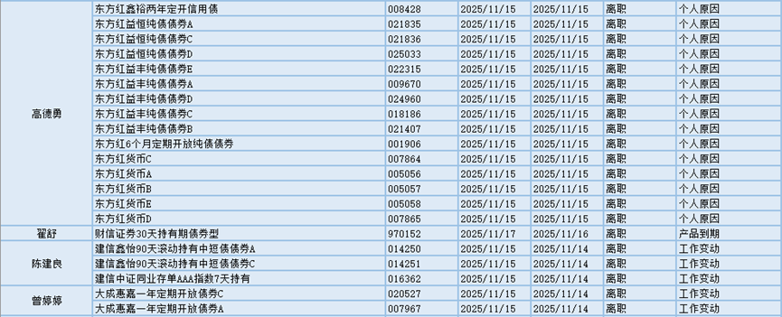 根据巨灵统计的数据显示,近30天(10.18-11.17)共有586只基金产品的基金经理发生离职变动。其中今天(11.17)有57只基金产品发布基金经理离职公告,从变动原因上来看,有10位基金经理是由于工作变动而从管理的16只基金产品中离职,有5位基金经理是由于个人原因而从管理的32只基金产品中离职。有5位基金经理是由于产品到期而从管理的9只基金产品中离职。