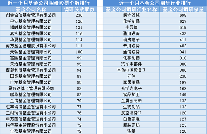 近一个月(10月18日-11月17日),创金合信基金参与公司调研的数量最多,共调研236家上市公司,然后调研较为活跃的还有平安基金、博时基金和嘉实基金,分别调研126家、121家、116家上市公司;从调研行业上来看,基金公司对医疗器械行业的上市公司调研次数最多,共有698次,其次是化学制品行业,基金公司调研了627次。