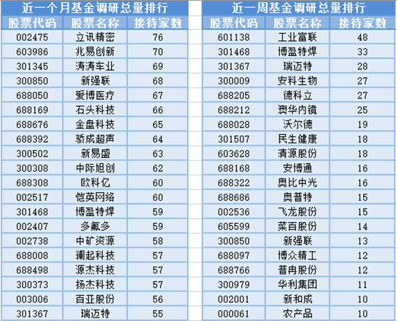 将时间周期缩短到最近一周(11月10日-11月17日)来看,基金调研数量第一的公司是工业富联,属于通信传输设备行业,主营业务为各类电子设备产品的设计、研发、制造与销售,依托工业互联网为全球客户提供智能制造和科技服务解决方案。共被48家基金机构调研,然后被调研数量较多的股票是博盈特焊、瑞迈特和安科生物,分别接受33家、28家和27家基金机构的调研。