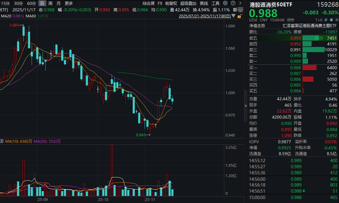 港股方面,新消费“纯”度更高的港股通消费50ETF(159268)收跌0.3%,全天成交额超4200万元!资金面上,近20日累计“吸金”超10亿元,规模同类持续领先!