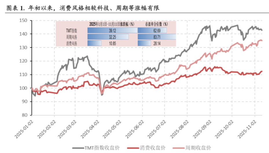 中银证券认为,CPI同比回暖、盈利-估值性价比占优催化,消费风格或将迎来轮动补涨。2025年以来,科技领涨趋势明显,年初以来涨幅高达39.12%,但相比之下消费风格则表现相对弱势,年初以来涨幅仅为10.85%,估值也处于较低水平Q3以来,前期领涨的科技板块进入震荡平台期,随着三季报披露结束,市场进入业绩空窗期,市场风格轮动加速。