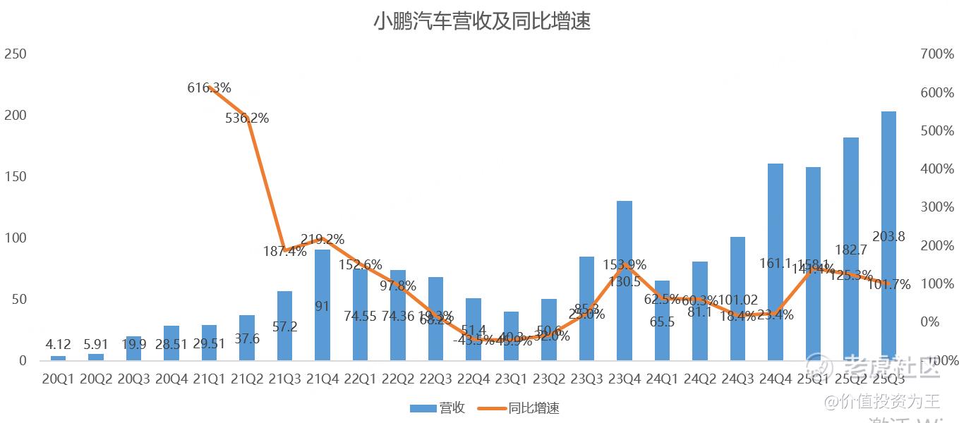 具体来看,小鹏三季度营收203.8亿,同比增长101.7%,略超管理层给出的196-210亿指引中值,不及分析师预期的204.5亿: