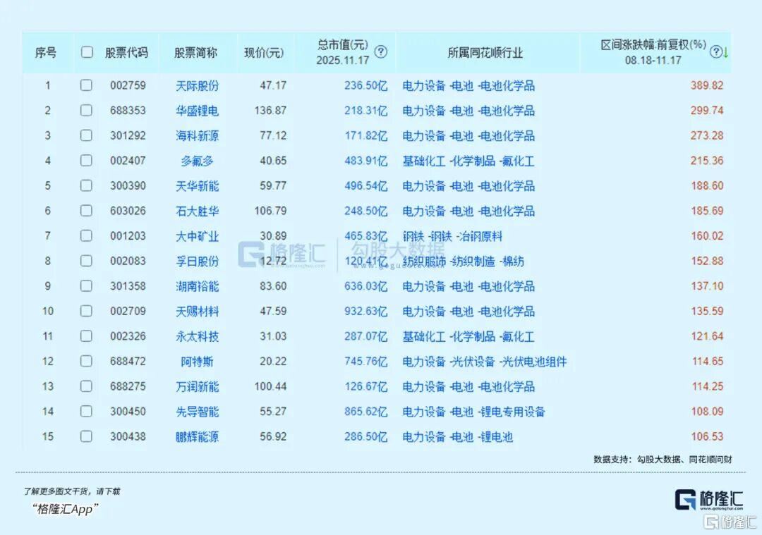 其中,近期表现最为强势的是与锂电有关的设备、材料等细分板块,近三个月来,天际股份、华盛锂电、海科新源、多氟多等相关的头部锂电产业链股已经强势飙涨2倍以上,另有十多只股价也翻了1倍以上。