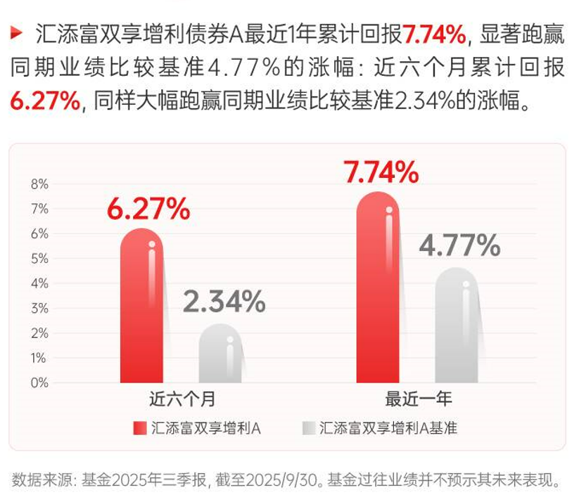 风险提示:基金有风险,投资需谨慎。本资料仅为宣传材料,不作为任何法律文件。投资有风险,基金管理人承诺以诚实信用、勤勉尽职的原则管理和运用基金资产,但不保证基金一定盈利,也不保证最低收益。投资人购买基金时应详细阅读《基金合同》《招募说明书》《基金产品资料概要》等法律文件,了解基金的具体情况。基金管理人的其他基金业绩和其投资人员取得的过往业绩并不预示其未来表现。本基金由汇添富基金管理股份有限公司发行与管理,代销机构不承担产品的投资、兑付和风险管理责任。本基金属于较低风险等级(R2)产品,适合经客户风险承受等级测评后结果为稳健型(C2)及以上的投资者,客户-产品风险等级匹配规则详见汇添富官网。在代销机构认申购时,应以代销机构的风险评级规则为准。本基金投资范围包括港股,会面临因投资环境、投资标的、市场制度以及交易规则等差异带来的特有风险。汇添富双享增利债券A自2023/6/20成立以来截至2024年底各年及2025上半年业绩及基准分别为(%):-0.57/0.51、5.78/8.41、1.56/1.88,以上数据来自基金各年年报及2025年二季报,截至2025/6/30。宋鹏管理的其他同类基金如下:2021/8/26开始管理的汇添富鑫瑞债券A(与刘通共同管理,刘通自2020-03-23开始管理)自2016/12/26成立以来截至2024年底各年及2025上半年业绩及基准分别为(%):3.47/-3.38、5.66/4.79、3.54/1.31、1.82/-0.06、3.51/2.1、1.79/0.51、3.94/2.06、5.72/4.98、1.07/-0.14;2021/10/20开始管理的汇添富稳鑫120天滚动持有债券(与丁巍共同管理,丁巍自2021-10-20开始管理)自2021/10/20成立以来截至2024年底各年及2025上半年业绩及基准分别为(%):0.98/0.48、2.91/2.27、3.94/2.55、3.14/2.36、1/0.78;2021/12/23开始管理的汇添富双享回报债券(与丁巍共同管理,丁巍自2021-12-23开始管理)自2021/12/23成立以来截至2024年底各年及2025上半年业绩及基准分别为(%):-2.55/1.48、-0.03/2.89、8.23/8.41、2.42/1.88;2022/8/1开始管理的汇添富淳享一年定开债券发起式A(与丁巍共同管理,丁巍自2022-08-01开始管理)自2022/8/1成立以来截至2024年底各年及2025上半年业绩及基准分别为(%):-1.02/0.75、5.6/4.78、7.22/7.61、1.04/1.05;2023/6/16开始管理的汇添富添添鑫多元收益9个月持有混合A(与刘通共同管理,刘通自2024-03-13开始管理)自2023/6/16成立以来截至2024年底各年及2025上半年业绩及基准分别为(%):-0.79/-2.09、6.44/7.2、1.52/0.88;2023/12/5开始管理的汇添富稳鑫90天持有债券A(与丁巍共同管理,丁巍自2021-10-20开始管理)2023/12/5成立,2024年底各年及2025上半年业绩及基准分别为(%):4.2/2.34、0.95/0.78;茹奕菡管理的其他同类基金如下:2018/12/24开始管理的汇添富安心中国债券A自2013/11/22成立以来至2024年底各年及2025上半年业绩及基准分别为(%):4.97/6.54、7.86/4.19、0.53/-1.63、0.96/-3.38、5.28/4.79、4.03/1.31、1.82/-0.06、3.57/2.1、1.5/0.51、2.38/2.06、5.32/4.98、0.43/-0.14;以上数据来自各基金各年年报及2025年半年报,截至2025/6/30。