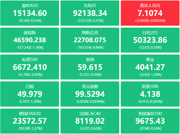 外盘:市场关注对AI估值泡沫的担忧、板块轮动、以及美联储降息预期变化等因素,美股三大股指在科技股拖累下集体收跌,其中道指跌557.24点,跌幅1.18%报46590.24点;纳指跌192.51点,跌幅0.84%报22708.07点;标普500跌61.70点,跌幅0.92%报6672.41点;科技股多数下跌,AMD、英特尔跌超2%,英伟达、苹果、甲骨文、Meta跌超1%,谷歌逆势涨超3%;黄金矿业股普跌,赫克拉矿业跌超4%,金田、哈莫尼黄金跌超3%;加密货币概念股走弱,Coinbase跌超7%,Circle跌超6%;中概股多数下跌,纳斯达克中国金龙指数收跌1.21%,小鹏汽车跌超10%,理想汽车跌超4%,网易、百度、蔚来跌超1%,阿里巴巴涨超2%。