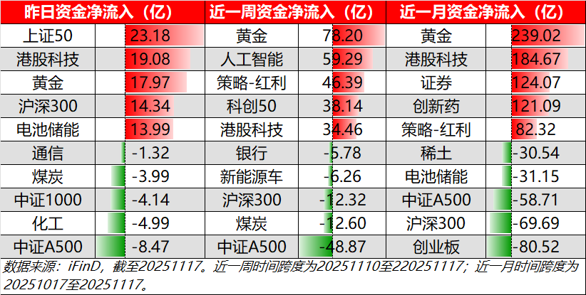 从日、周和月三重维度出发,资金净流入方面,黄金和港股科技在三重维度上均位居前列,收到资金青睐。而在资金净流出方面,中证A500则始终保持在资金净流出的前列。
