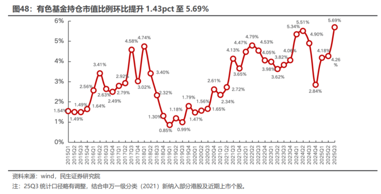 机构投资者的布局行为同样值得关注。根据民生证券统计,2025年第三季度,公募基金对有色金属板块的持仓比例升至5.69%,环比上季度增加1.43%,达到2021年以来新高