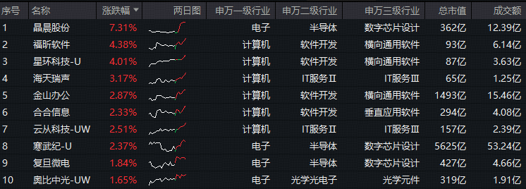 成份股方面,晶晨股份领涨超7%,福昕软件、星环科技涨逾4%,海天瑞声、金山办公、合合信息等个股大幅跟涨。权重股寒武纪涨超2%