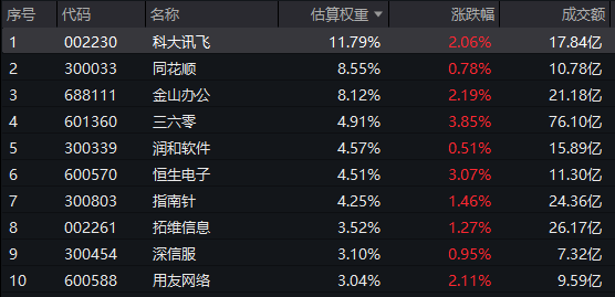 截至13:30,软件50ETF(159590)标的指数热门成分股多数飘红:三六零、恒生电子涨超3%,科大讯飞、金山办公涨超2%,同花顺、润和软件微涨。
