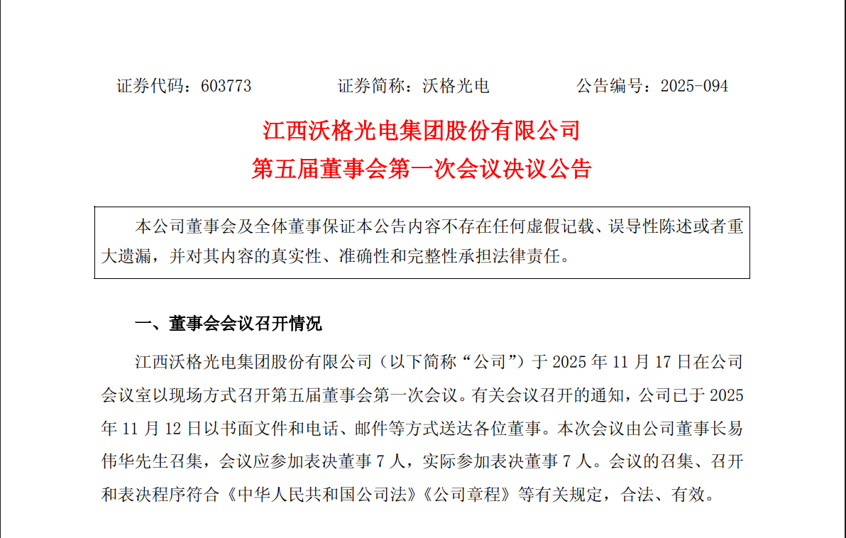 11月17日晚间沃格光电发布公告称,公司第五届第一次董事会会议于2025年11月17日在公司会议室以现场方式召开。会议审议了《关于选举公司第五届董事会董事长的议案》、审议通过《关于选举公司第五届董事会专门委员会委员及主任委员的议案》、审议通过《关于聘任公司总经理的议案》等文件。公司第五届董事会专门委员会委员任期自公司第五届董事会第一次会议审议通过之日起至第五届董事会任期届满之日止。其中,公司审计、提名和薪酬与绩效考核委员 会中独立董事均占半数以上,并由独立董事担任主任委员(召集人),且审计委员会的主任委员李汉国先生为会计专业人士,符合相关法律法规、《公司章程》及公司董事会专门委员会议事规则的规定。