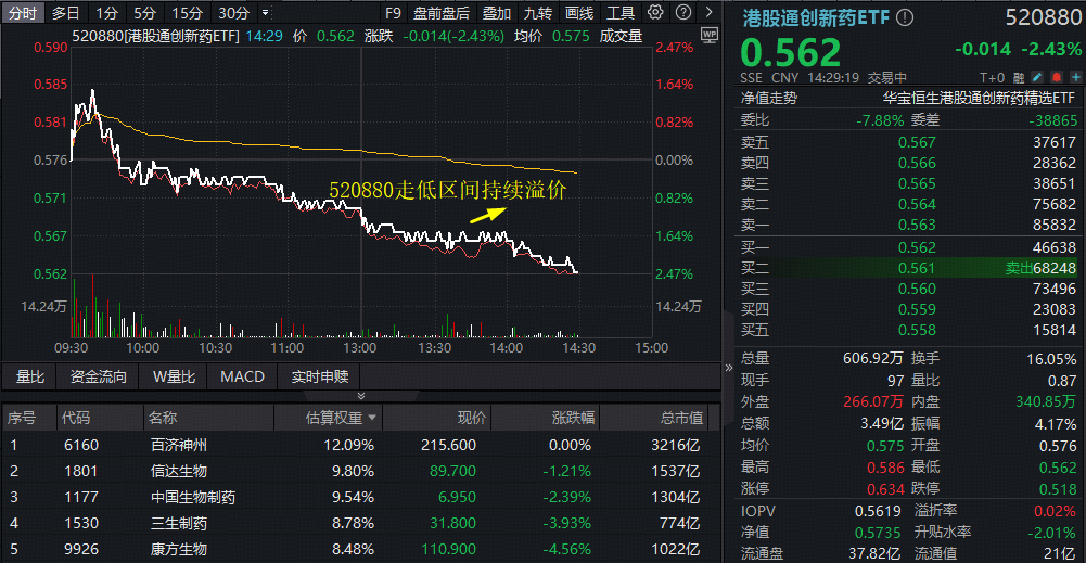 11月18日午后,港股创新药加速走低,100%创新药研发标的——港股通创新药ETF(520880)跌逾2%下穿10日线,场内溢价再起,或有低吸资金逢跌涌入。