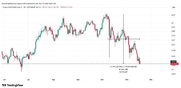 Kobeissi 的数据显示:本应是利好消息的事件,在整个 10 月和 11 月对加密货币市场的表现产生了矛盾的影响。“加密货币价格下跌 25% 的孤立性进一步支持了我们的观点:这是一个基于杠杆和清算的加密货币‘熊市’。”