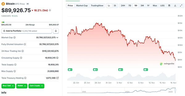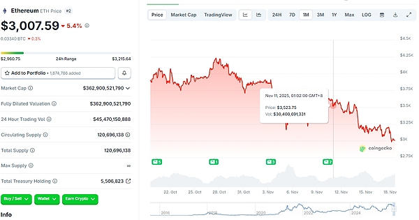 近一个月,BTC已经跌去16.2%。截至发稿,BTC价格已经跌破9万美元大关,报89926.75美元,ETH徘徊在3000美元大关左右,报3007.59美元。