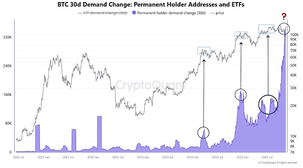 CryptoQuant 的数据显示:自 10 月 6 日以来,长期持有比特币且对价格不敏感的投资者已吸纳了 18.6 万枚比特币,这是近期周期中最大的增幅。历史上,这种激增往往预示着一波大涨,但这一次价格却下跌了,出现了罕见的背离。分析师目前认为有两种高概率出现的情况:随着供应枯竭和精明资金向更高位置分散投资,市场出现强劲反弹;最后一次大扫除,清除剩余的胃口,为持久趋势的形成做准备。