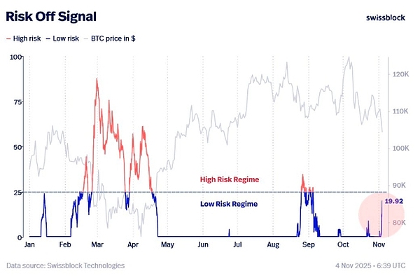 私人财富管理公司Swissblock表示:由于过去几天抛售压力加剧,比特币的避险信号变得不稳定。 “如果该指标进入并持续处于高风险状态,则表明比特币正在进入熊市,这标志着结构性变化,而不是短期调整。”