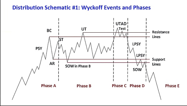 X 分析师@follis_重点介绍的示意图显示,比特币最近的结构遵循经典的五阶段威科夫分布,这种模式经常在宏观市场顶部附近出现,如下所示。@follis_ 表示,这种趋势非常强烈,以至于比特币牛市“可能真的已经结束了”。