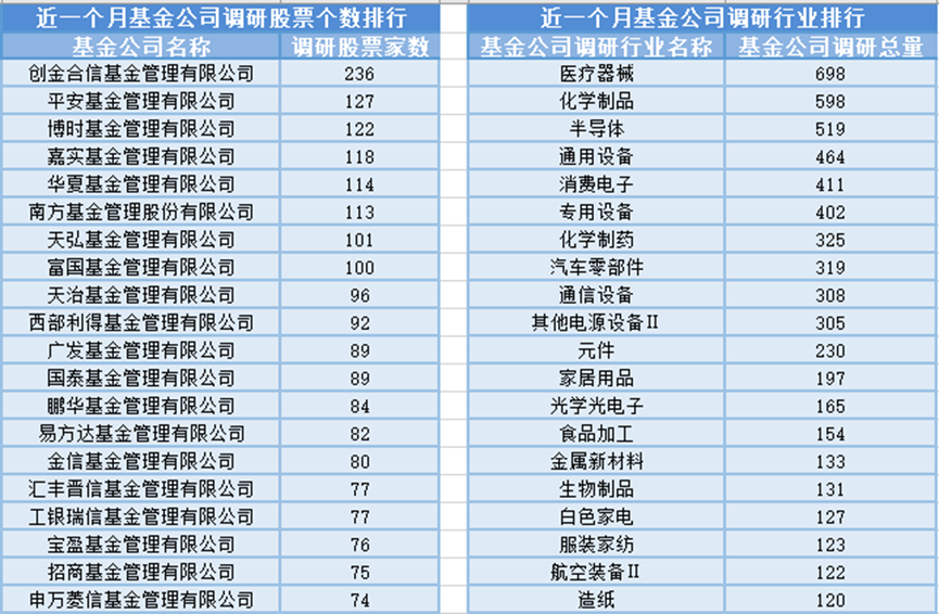 近一个月(10月18日-11月17日),创金合信基金参与公司调研的数量最多,共调研236家上市公司,然后调研较为活跃的还有平安基金、博时基金和嘉实基金,分别调研127家、122家、118家上市公司;从调研行业上来看,基金公司对医疗器械行业的上市公司调研次数最多,共有698次,其次是化学制品行业,基金公司调研了598次。